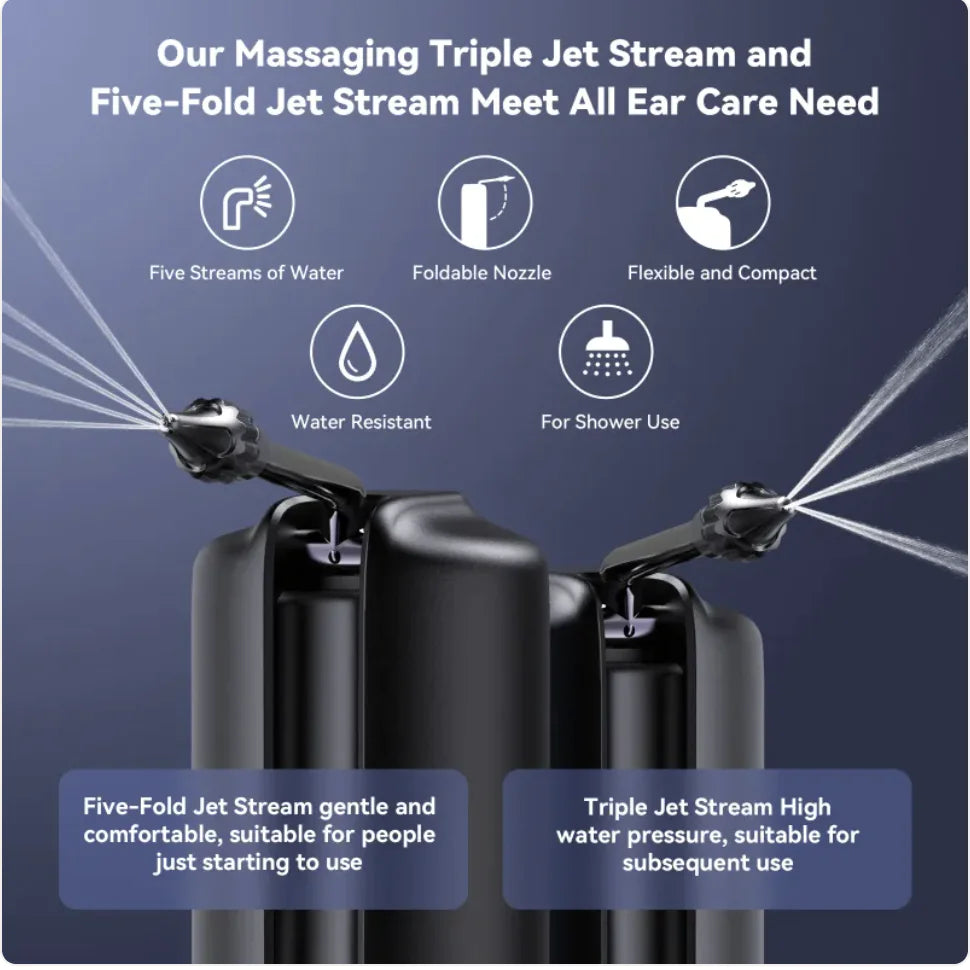 • Features: Electric shower-style ear irrigation with adjustable nozzles